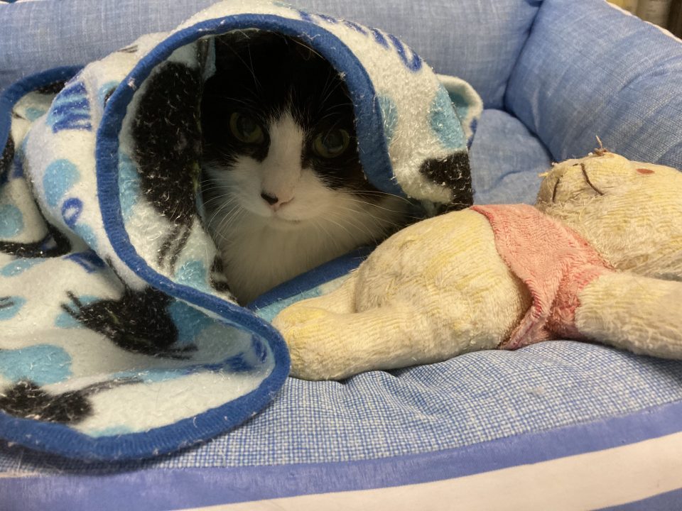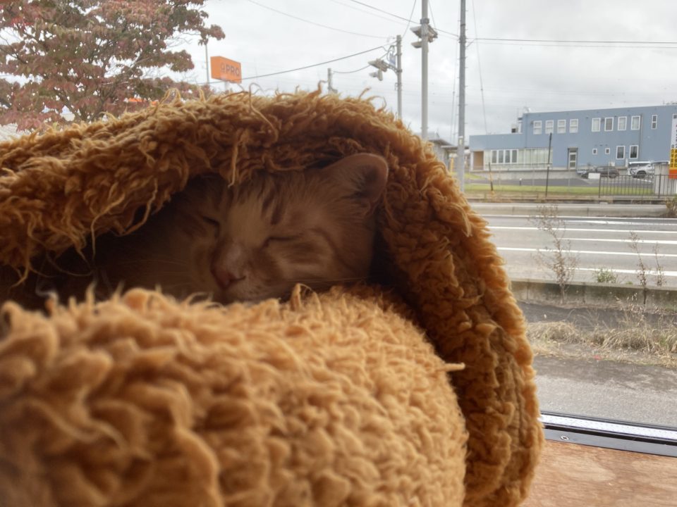 ☝夏用のひんやりベッドで毛布にくるまり、寒さアピールをするなでしこ